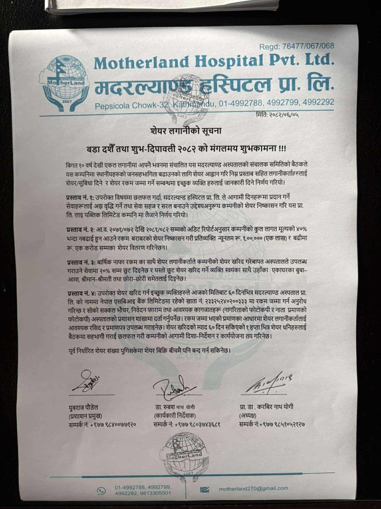 मदरल्यान्ड हस्पिटल प्रालिले प्रदान गर्ने सेवाहरुलाई आगामी दिनमा अझ अत्याधुनिक बनाउने र सेवा सहज र सरल बनाउने उद्देश्यले कम्पनीको शेयर निष्कासन गरेर पब्लिक लिमिटेड कम्पनी लग्ने निर्णय भएको प्रालिका अध्यक्ष करबिर नाथ योगीले जानकारी गराए।
