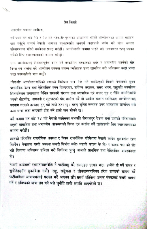 जेनजी आन्दोलनपछि काँग्रेसमा देशभरबाट विशेष महाधिवेशन, अर्लि अधिवेशन वा राष्ट्रिय सम्मेलनको माग चर्को रुपमा उठिरहेको छ।