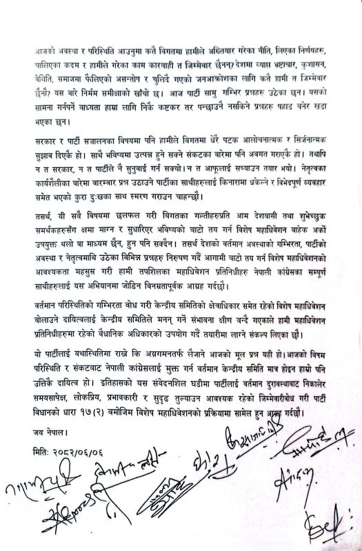 तर समय र नयाँ पुस्ताले पुरानै नेतृत्व तथा उही डर्राको काँग्रेस अब स्वीकार्य नहुने देखिएकाले विशेष महाधिवेशनको माग गरिएको हस्ताक्षरकर्ताको भनाइ छ।