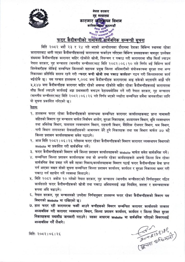 जिल्लास्थित सार्वजनिक निकायमा विवरण उपलब्ध गराउने र कुनै सार्वजनिक सेवा लिन आएको खण्डमा पक्राउ गर्न कारागार विभागले निर्देशन दिएको छ। ।