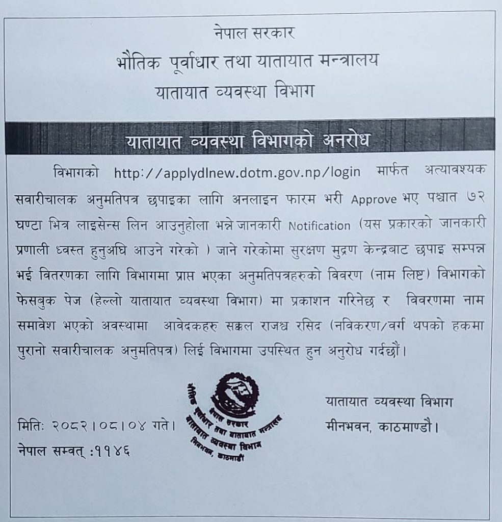 सूचनामा भनिएको छ, ‘सुरक्षण मुद्रण केन्द्रबाट छपाइ सम्पन्न भई वितरणका लागि विभागमा प्राप्त भएका अनुमतिपत्रहरूको विवरण (नाम लिस्ट) विभागको फेसबुक पेज (हेलो यातायात व्यवस्था विभाग) मा प्रकाशन गरिनेछ।’