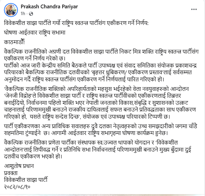जेनजी आन्दोलनपछिको बदलिँदो राजनीति परिस्थितिले विवेकशील साझा र रास्वपा पार्टीबीचको एकीकरण तिब्रत्तर बनाएको जनाउँदै एकतापछि पहिलो शक्ति भएर नेपाली जनताको संवृद्धि, विकास र सुशासनको उत्कट चाहनालाई परिणाममुखी बनाउने राजकीय दायित्वलाई सफल बनाउने प्रतिवद्धतासहित एकीकरण हुन लागेको उपाध्यक्ष परियारको भनाइ छ।