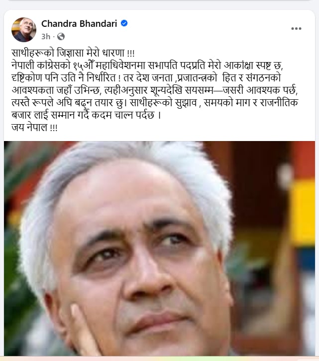 पुस २७ देखि २९ सम्म काठमाडौंमा हुने कांग्रेसको महाधिवेशनलाई लक्षित गर्दै उनले सञ्जालमा लेखेका छन्- ‘नेपाली कांग्रेसको १५ औं महाधिवेशनमा सभापति पदप्रति मेरो आकांक्षा स्पष्ट छ, दृष्टिकोण पनि उति नै निर्धारित। तर देश जनता, प्रजातन्त्रको हित र संगठनको आवश्यकता जहाँ उभिन्छ, त्यहीअनुसार शून्यदेखि सयसम्म जसरी आवश्यक पर्छ, त्यस्तै रूपले अघि बढ्न तयार छु। साथीहरूको सुझाव , समयको माग र राजनीतिक बजारलाई सम्मान गर्दै कदम चाल्न पर्दछ।’