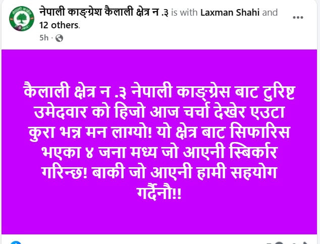 उम्मेद्वारकै चर्चा चलिरहँदा ‘नेपाली काङ्ग्रेश कैलाली क्षेत्र न ३’ नामकाे फेसबुकमा लेखियाे- ‘कैलाली क्षेत्र न.३ नेपाली काङ्ग्रेसबाट टुरिस्ट उमेदवारको हिजो आज चर्चा देखेर एउटा कुरा भन्न मन लाग्यो! यो क्षेत्रबाट सिफारिस भएका ४ जनामध्य जो आएनी स्वीकार गरिन्छ! बाकी जो आएनी हामी सहयोग गर्दैनौ!’