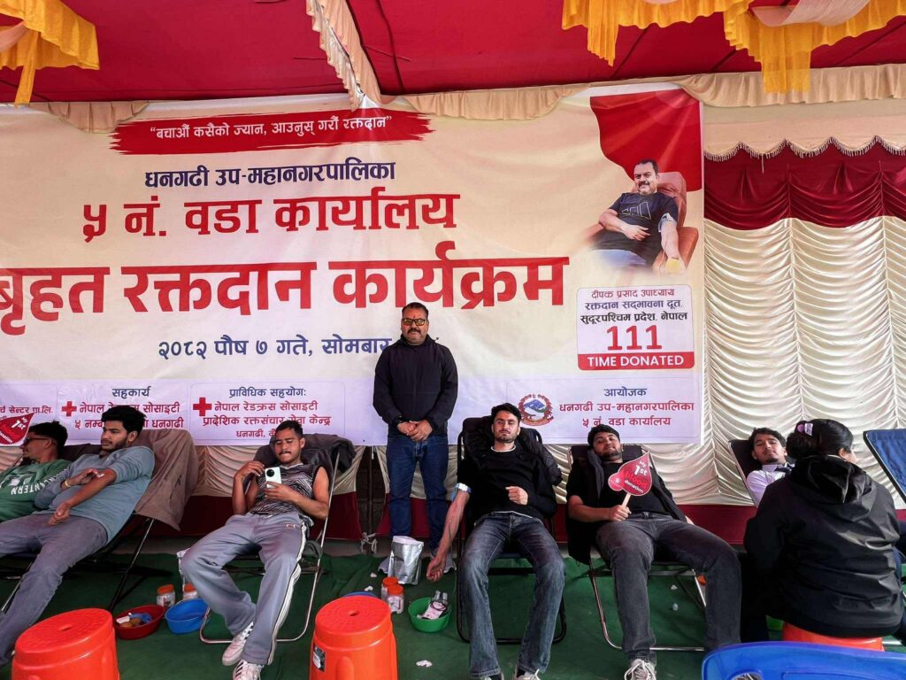 कैलाली । धनगढी उपमहानगरपालिका वडा नम्बर ५ को कार्यालयले आयोजना गरेको बृहत् रक्तदान कार्यक्रम सम्पन्न भएको छ । कार्यक्रममा एकैदिन २७० जनाले रक्तदान गरेका छन्।