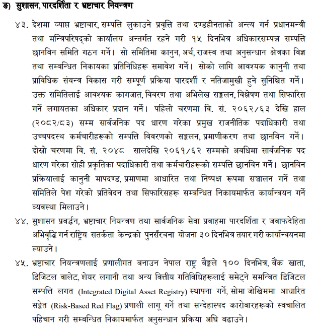 बालेन शाह नेतृत्वकाे सरकारले सार्वजनिक गरेको शासकीय सुधारसम्बन्धी १०० कार्यसूचीमा २०४८ सालदेखि २०८२ सालसम्म सार्वजनिक पद धारण गरेका प्रमुख राजनीतिक पदाधिकारी तथा उच्चपदस्थ कर्मचारीहरूको सम्पत्ति चरणवद्धरुपमा छानबिन गर्ने निर्णय गरेको हो।