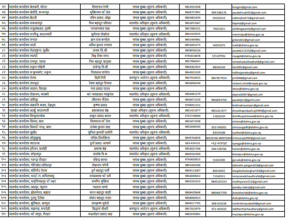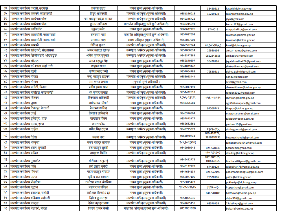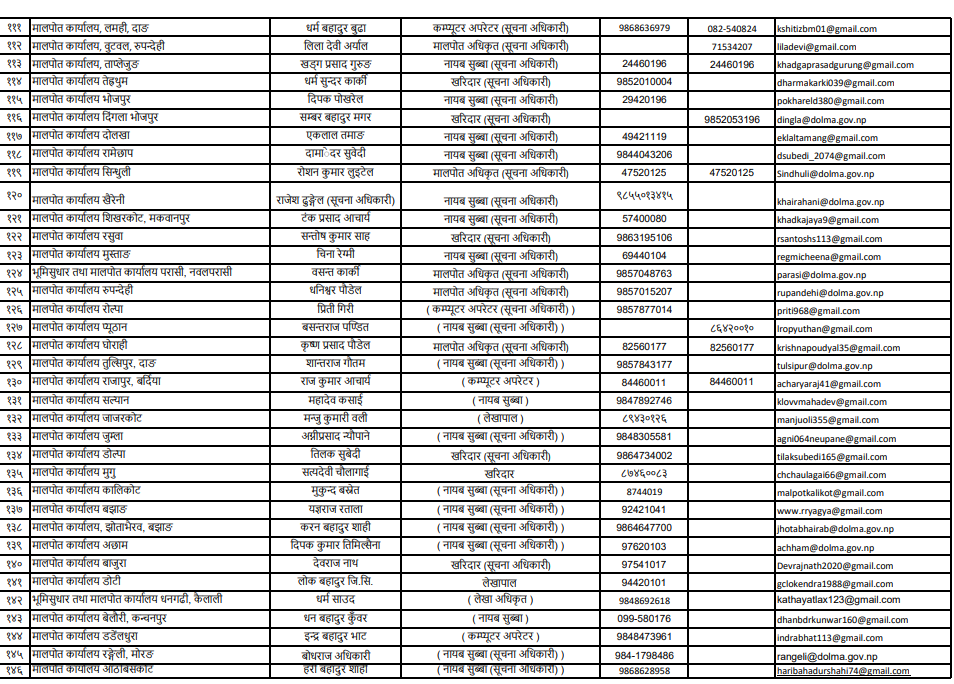 मालपोत र नापी विभाग तथा कार्यालयहरूका सम्बन्धित अधिकारीको विवरण सार्वजनिक गरिएको हो।