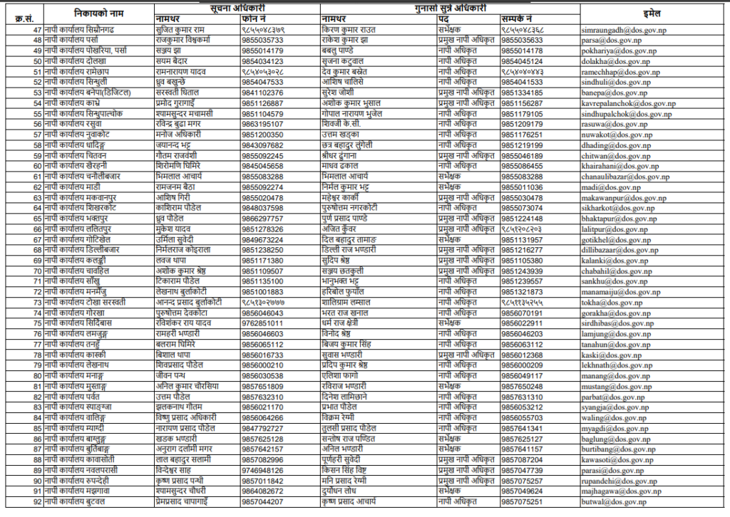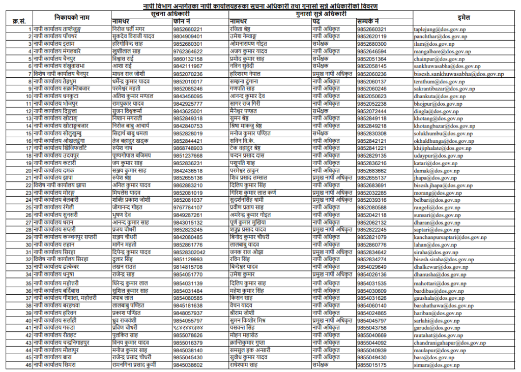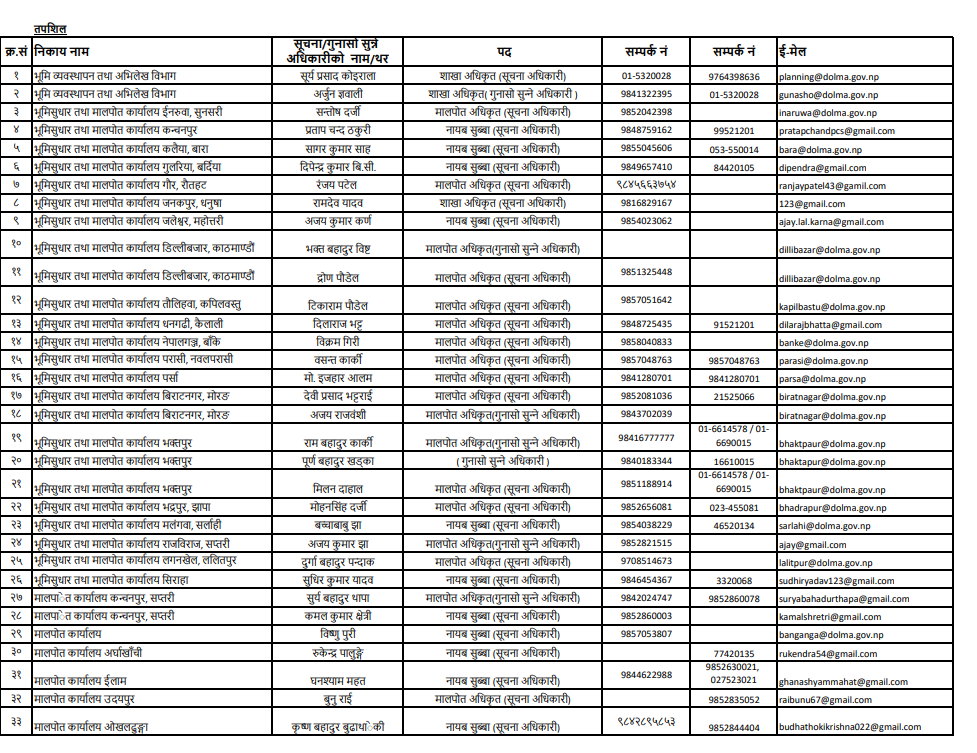 देशभरका मालपोत र नापीमा सूचना दिने र गुनासो सुन्ने अधिकारीको विवरण सार्वजनिक (सम्पर्क नम्बरसहित)